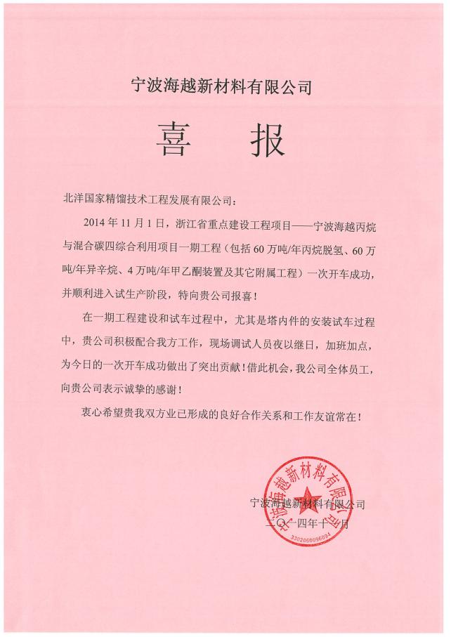 宁波海越新材料有限公司于2012年8月与北洋国家精馏技术工程发展有限公司签署丙烷-丙烯产品分离塔1#和丙烷-丙烯产品分离塔2#的塔内件订货合同,实现了CATOFIN丙烷脱氢工艺中这两台设备的首次国产化。北洋国家精馏技术工程发展有限公司根据多年的设计经验,将两台塔的塔盘总层数由工艺包方设定的290层减至240层,采用六溢流塔盘。这一设计大大节省了项目投资。